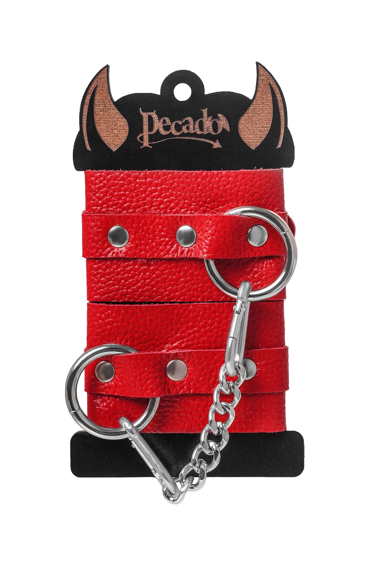Самый мягкие наручники из всего ассортимента Pecado. Лаконичный дизайн, насыщенно красный цвет и терпкий аромат материала - повышают градус возбуждения в процессе ролевых игр.Наручники выполнены из экологичной и натуральной кожи. Полностью ручная выделка материала обеспечивает хорошую износостойкость. Каждый миллиметр аксессуара очень тактильно приятный. Манжеты и ремешки не мнутся. При правильном использовании не оставляют следов на запястьях. Благодаря стальной застежке и отверстиям с люверсами можно подобрать нужный обхват. Между собой наручники соединены с помощью карабинов и короткой цепочки. Длина манжет – 18 см, ширина - 5,5 см.