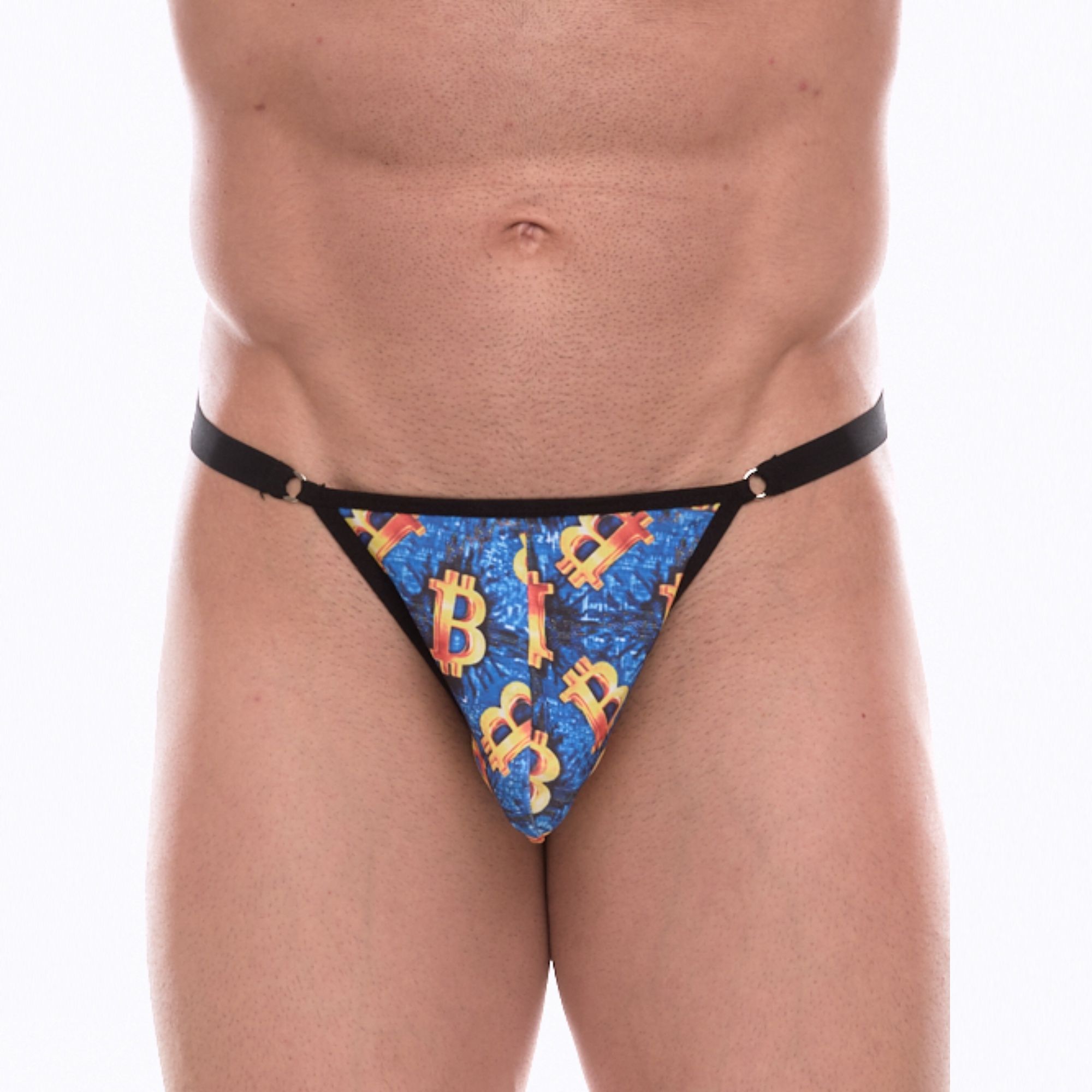 ОписаниеСиние мужские трусы-тонги с разноцветным принтом.