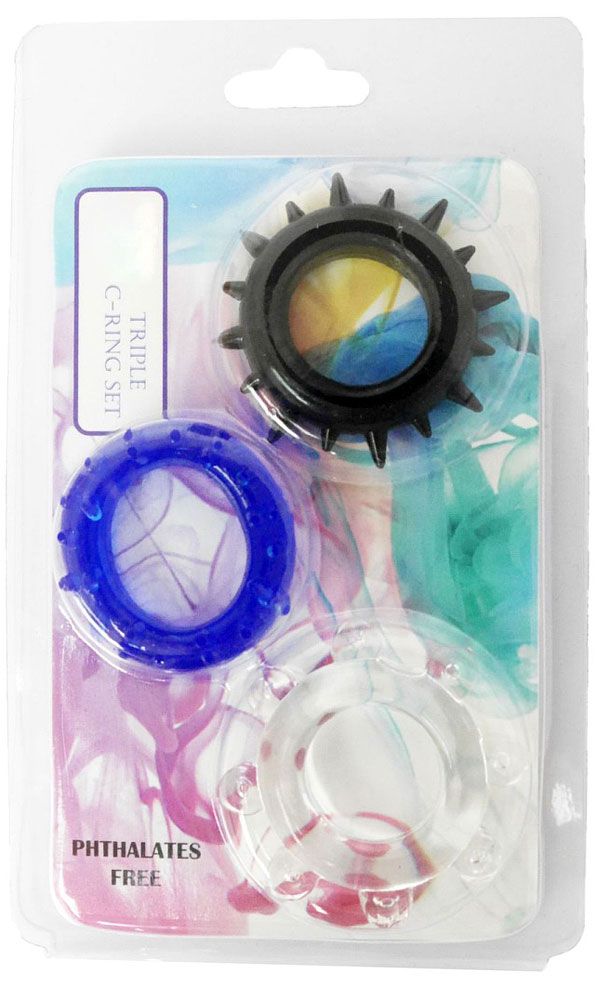 Эрекционные кольца изготовлены из очень эластичного материала. Они подходят для любого пениса. Набор из 3 эрекционных колец разного цвета: прозрачное, синее, черное.