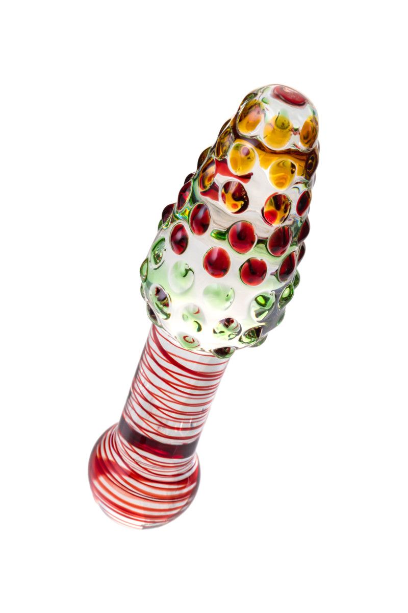 Этот яркий стеклянный фаллос можно вводить в вагину с любой стороны: и гладким конусом, усыпанным объемными точками по всей длине, и шариком на продолговатом основании.