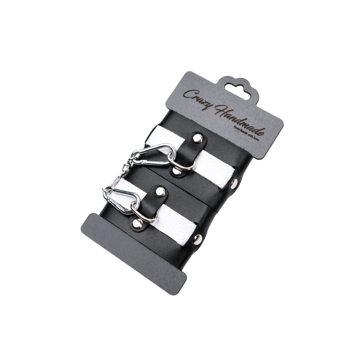 ОписаниеНаручники состоят из двух деталей: основа прямоугольной формы из натуральной кожи черного цвета и ремешок белого цвета с прочной хромированной фурнитурой в виде овального кольца. Расположение ремешка через прорези основной части является декоративным решением, а также служит для лучшей регулировки размера. В комплект входит соединительная цепочка с двумя карабинами. Общая длина - 25 см.