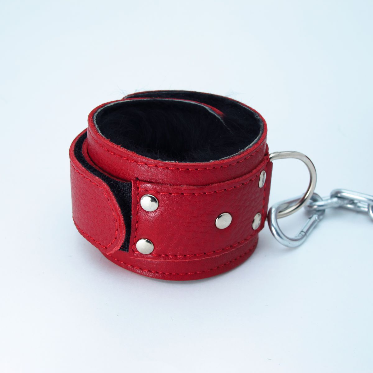 Кожаные наручники красного цвета. Украшены заклепками и соединяются между собой цепью с карабинами. Внутренняя часть наручников отделана черны мехом. Размер наручников регулируется при помощи застежки-липучки. Ширина - 5 см.