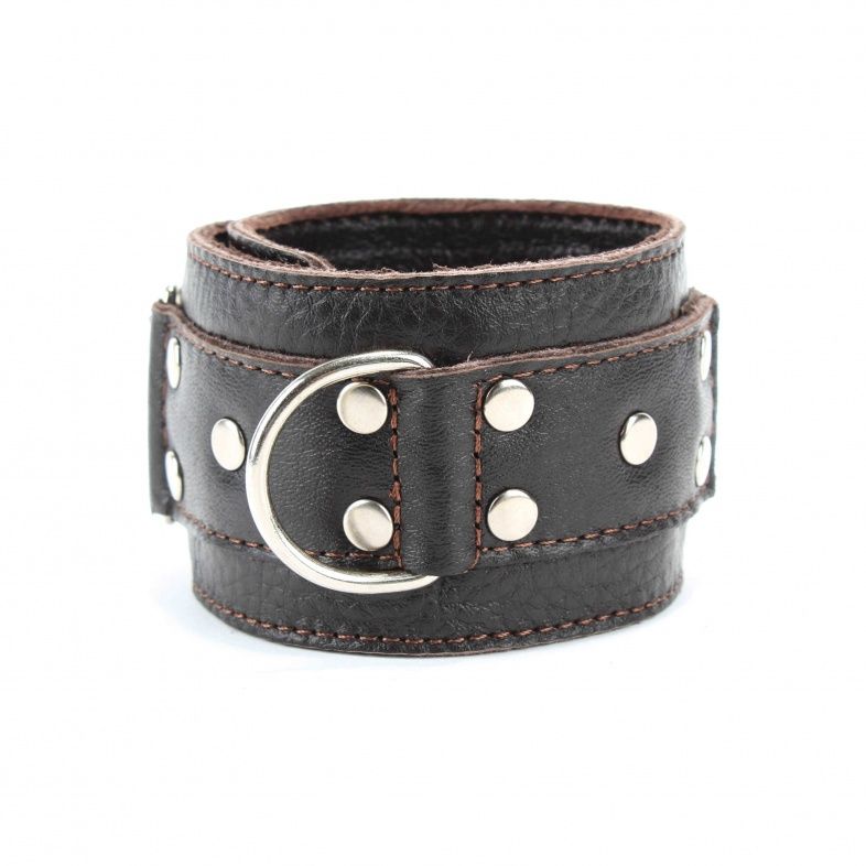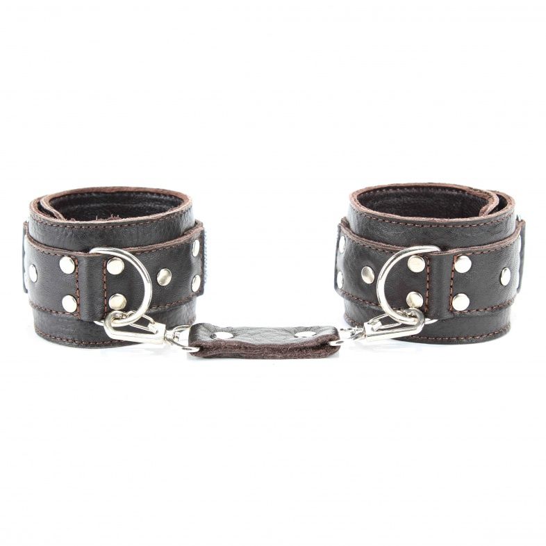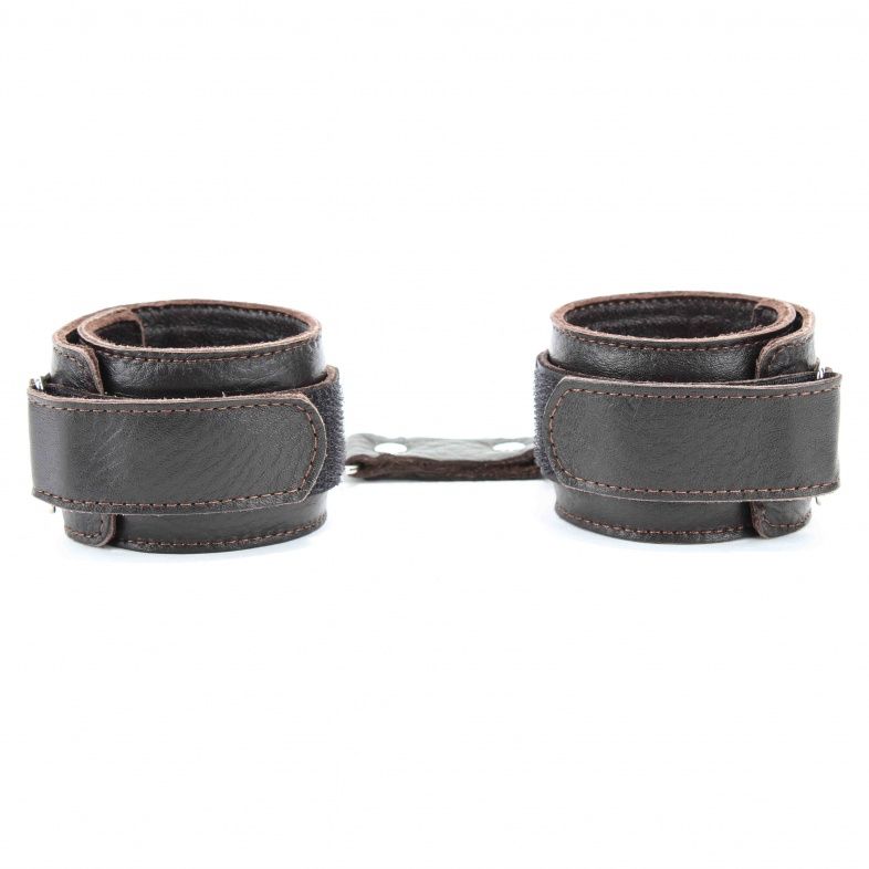 Наручники выполнены из натуральной мягкой коричневой кожи, легко, но надежно фиксируются ремнями на липучке, позволяя выбрать нужный размер, подойдут на обхват руки от 15 до 20 см. Аксессуар декорирован заклепками. Кожаное соединение на карабинах фиксирует наручники вместе. Мягкий подклад из натуральной кожи обеспечит комфортное пребывание в образе, помогая полностью погрузиться в БДСМ игру. Ширина - 5,5 см.