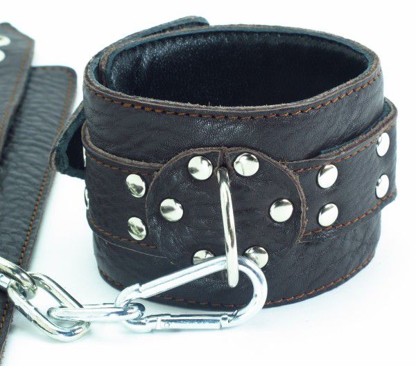 ОписаниеЧерные кожаные наручники на металлической цепочке. Выполнены с заклепками из металла.