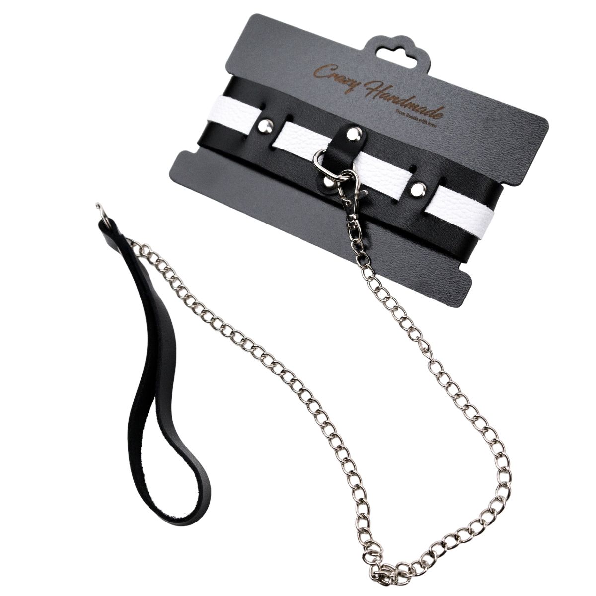 Черно-белый кожаный ошейник с поводком-цепочкой - lovestoryshop.ru
