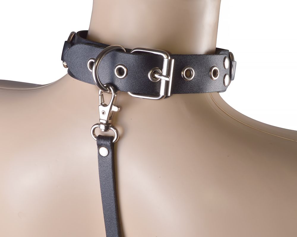 ОписаниеОшейник изготовлен из натуральной кожи, декорирован шестью металлическими кольцам. Размер регулируется при помощи пряжки. Поводок кожаный.