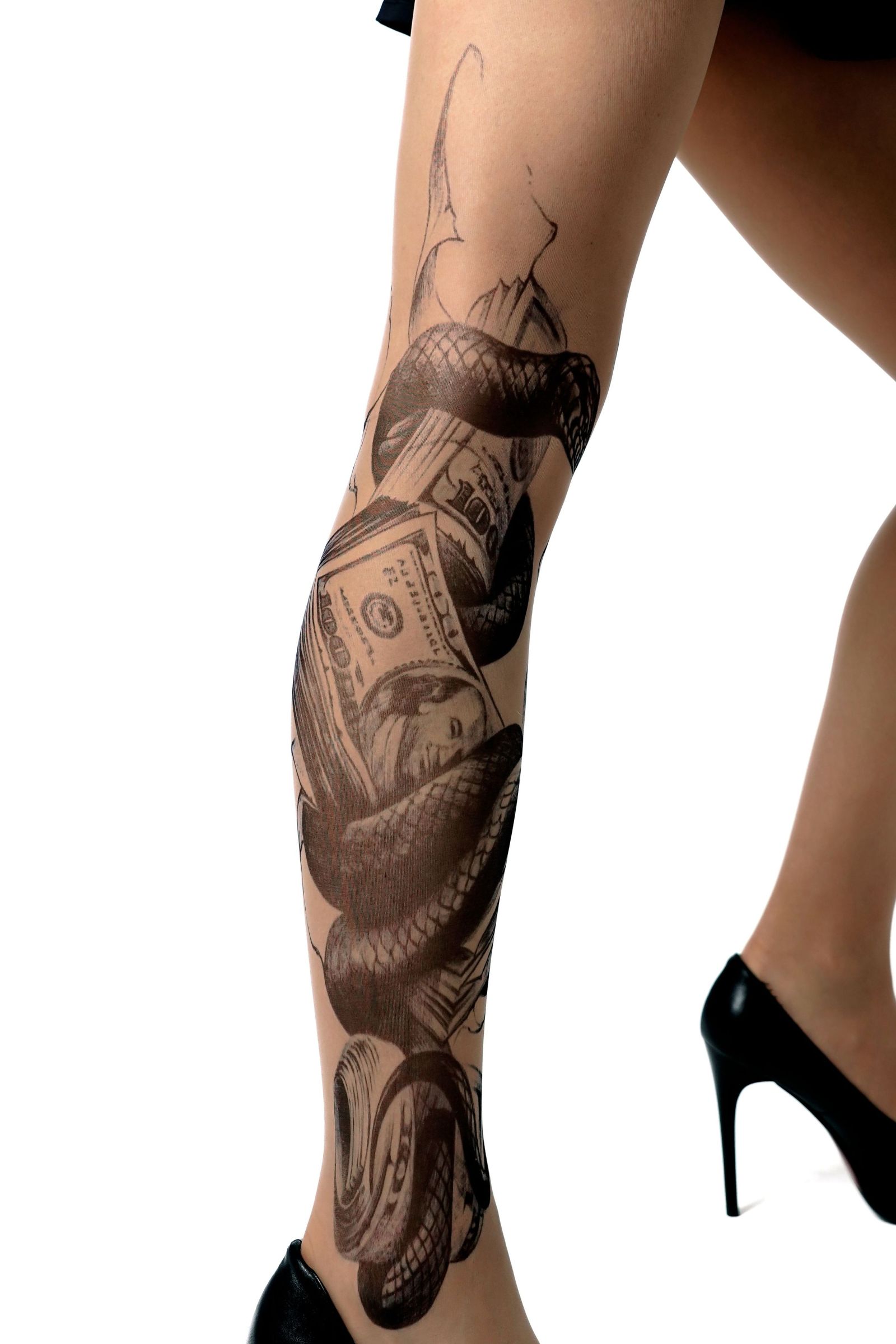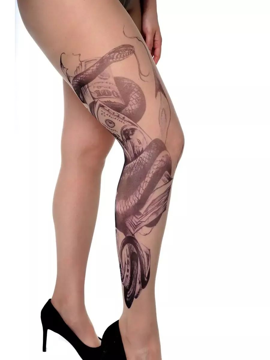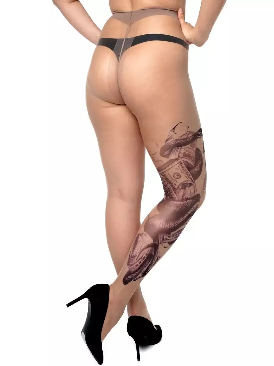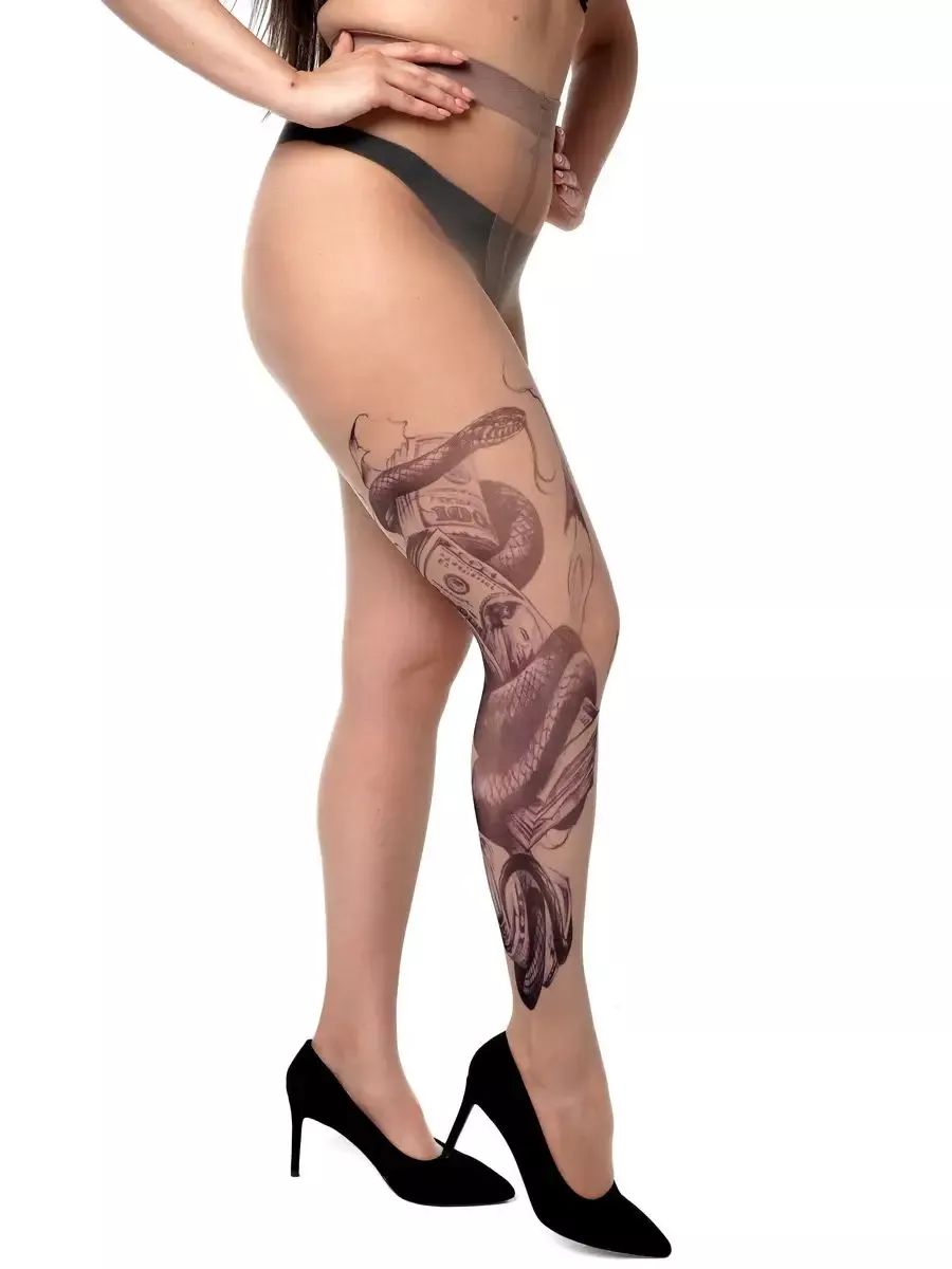 Колготки +size с имитацией тату в виде змеи. Принт не стирается, не выгорает со временем. Можно стирать в стиральной машине. Крепкие, подойдут на рост от 145 до 180 см. Плотность - 40 ден.