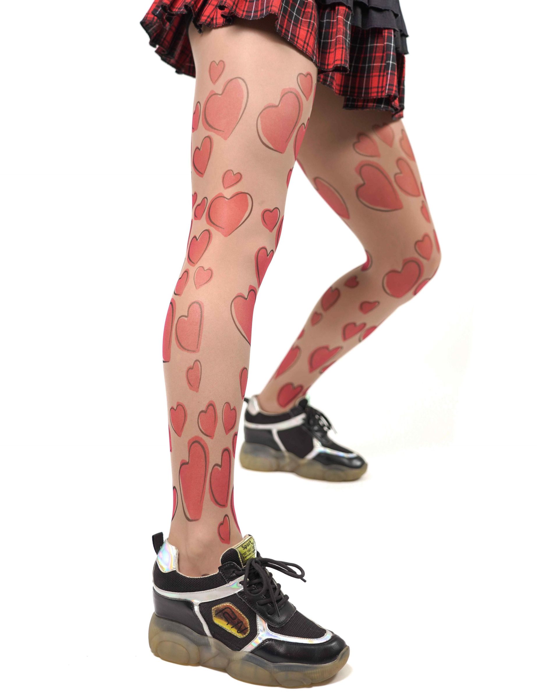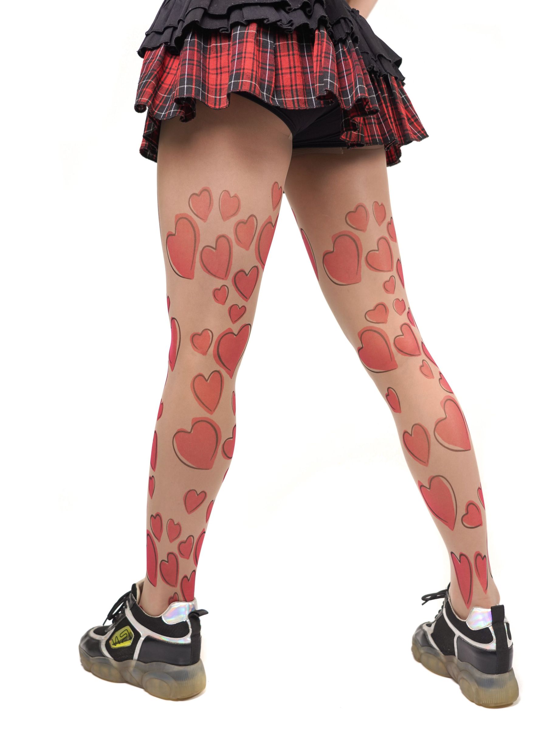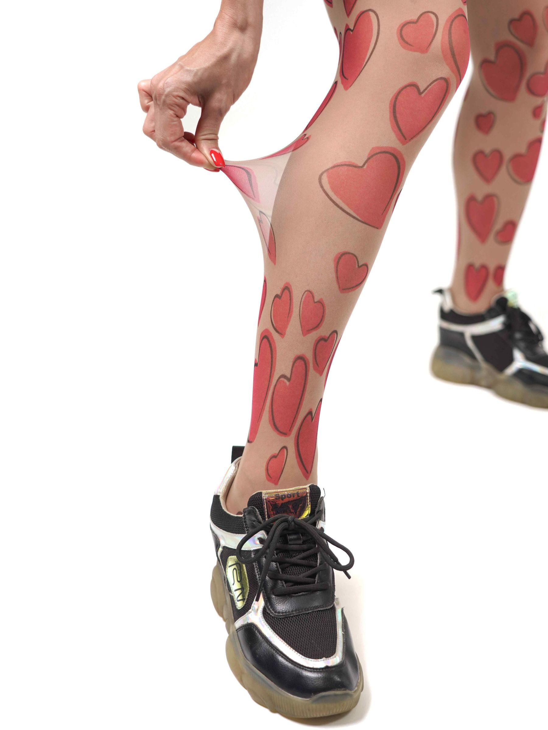 Озорные колготки с принтом в виде сердечек. Принт не стирается, не выгорает со временем. Можно стирать в стиральной машине. Крепкие, подойдут на рост от 145 до 180 см. Плотность - 40 ден.