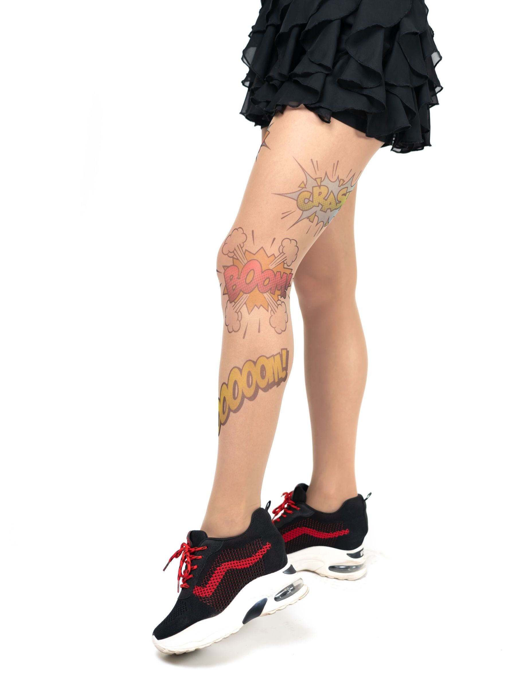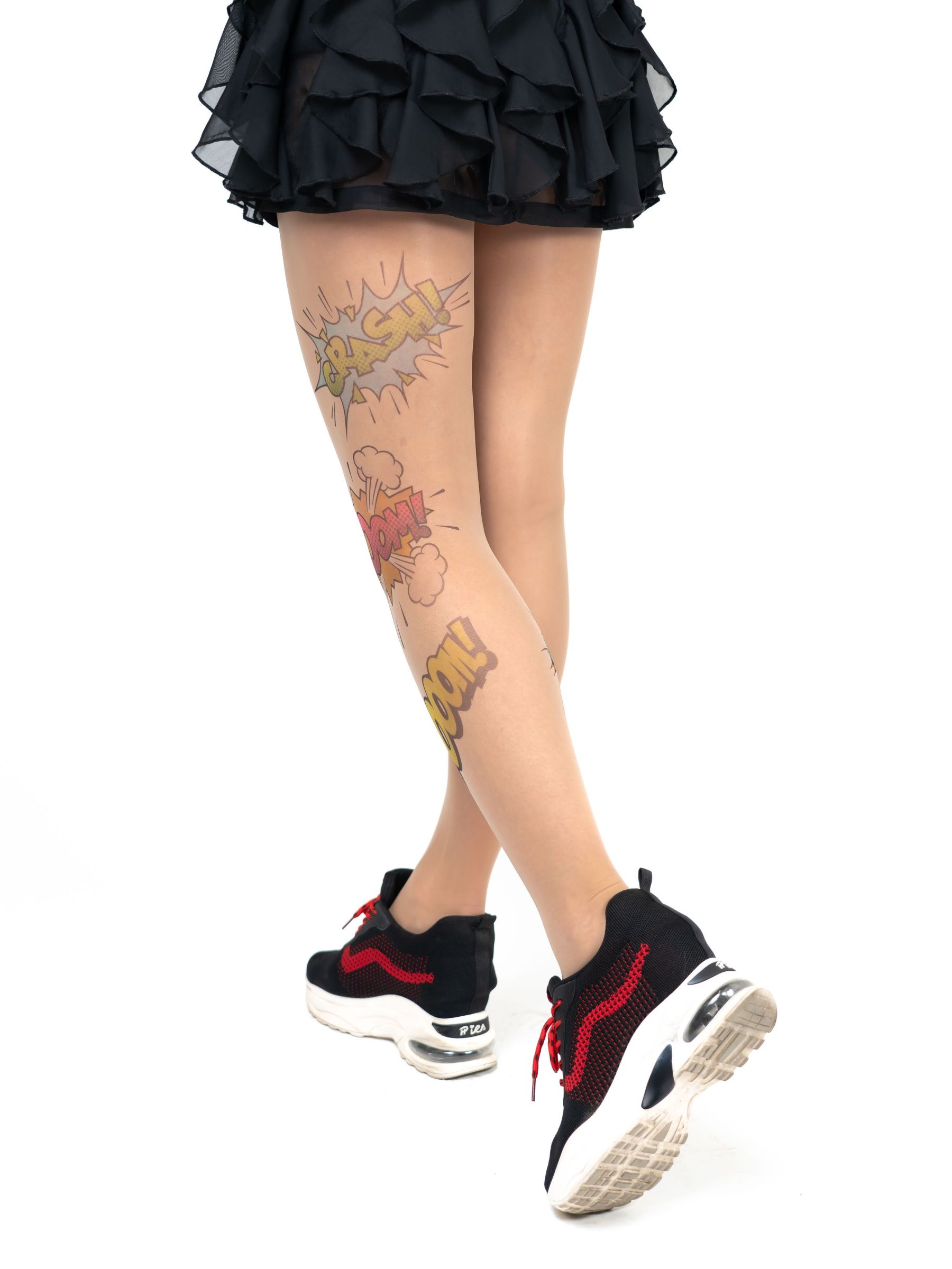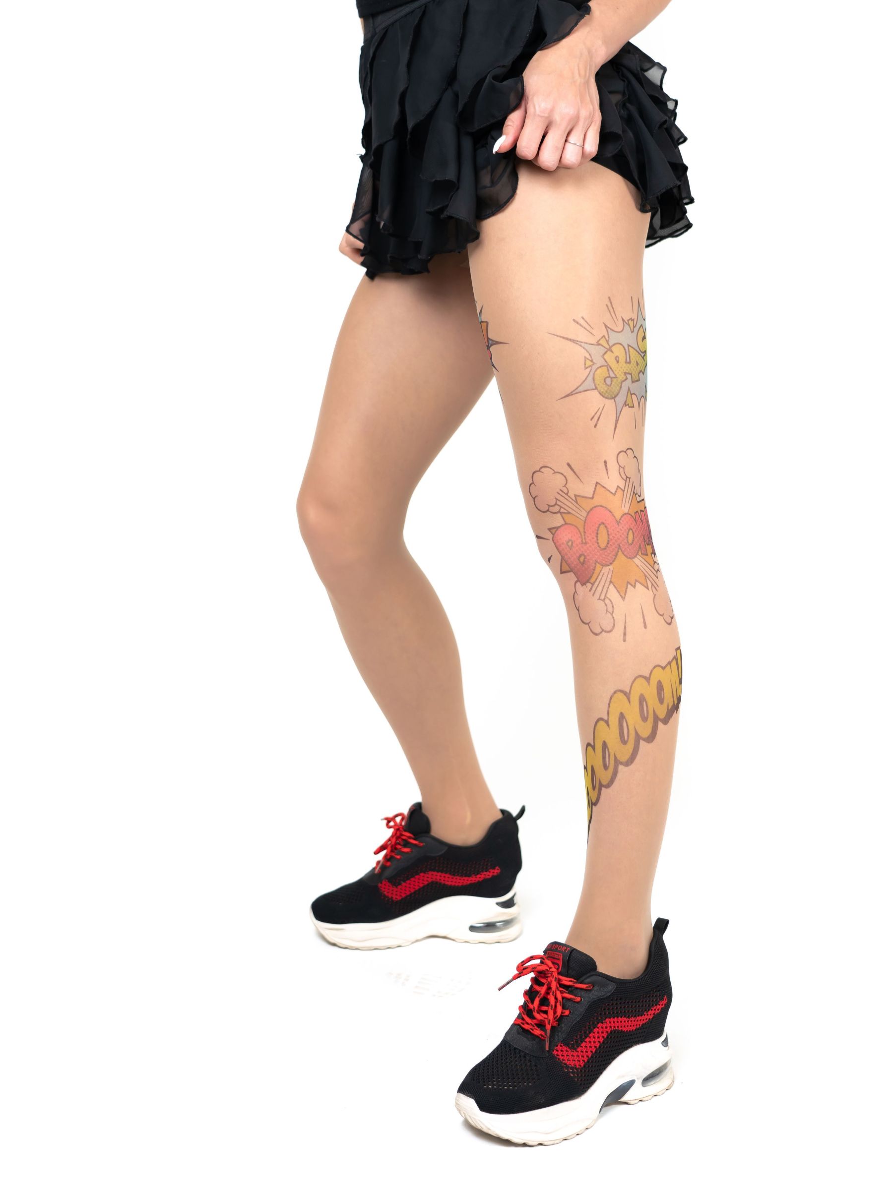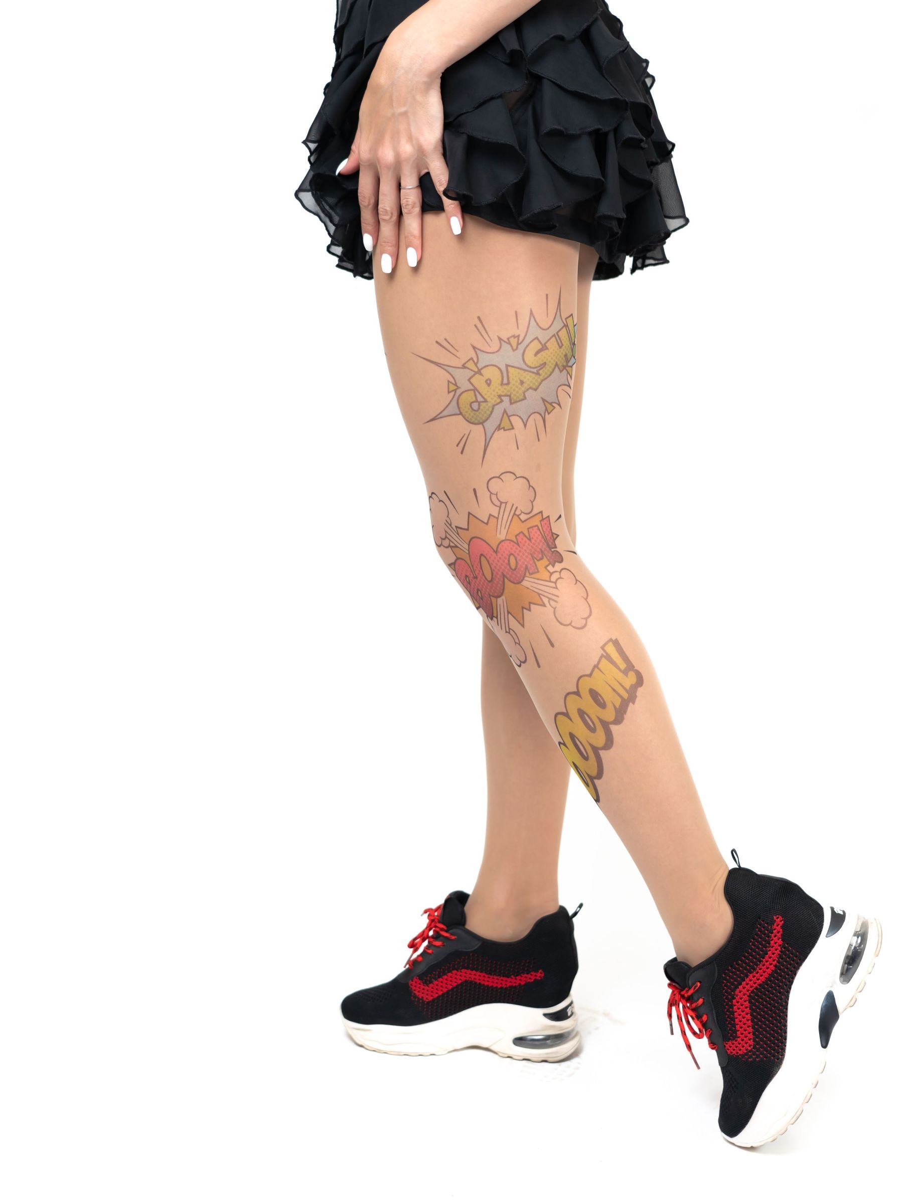 Колготки с принтом в виде цветных спич-баббл на левой ножке
