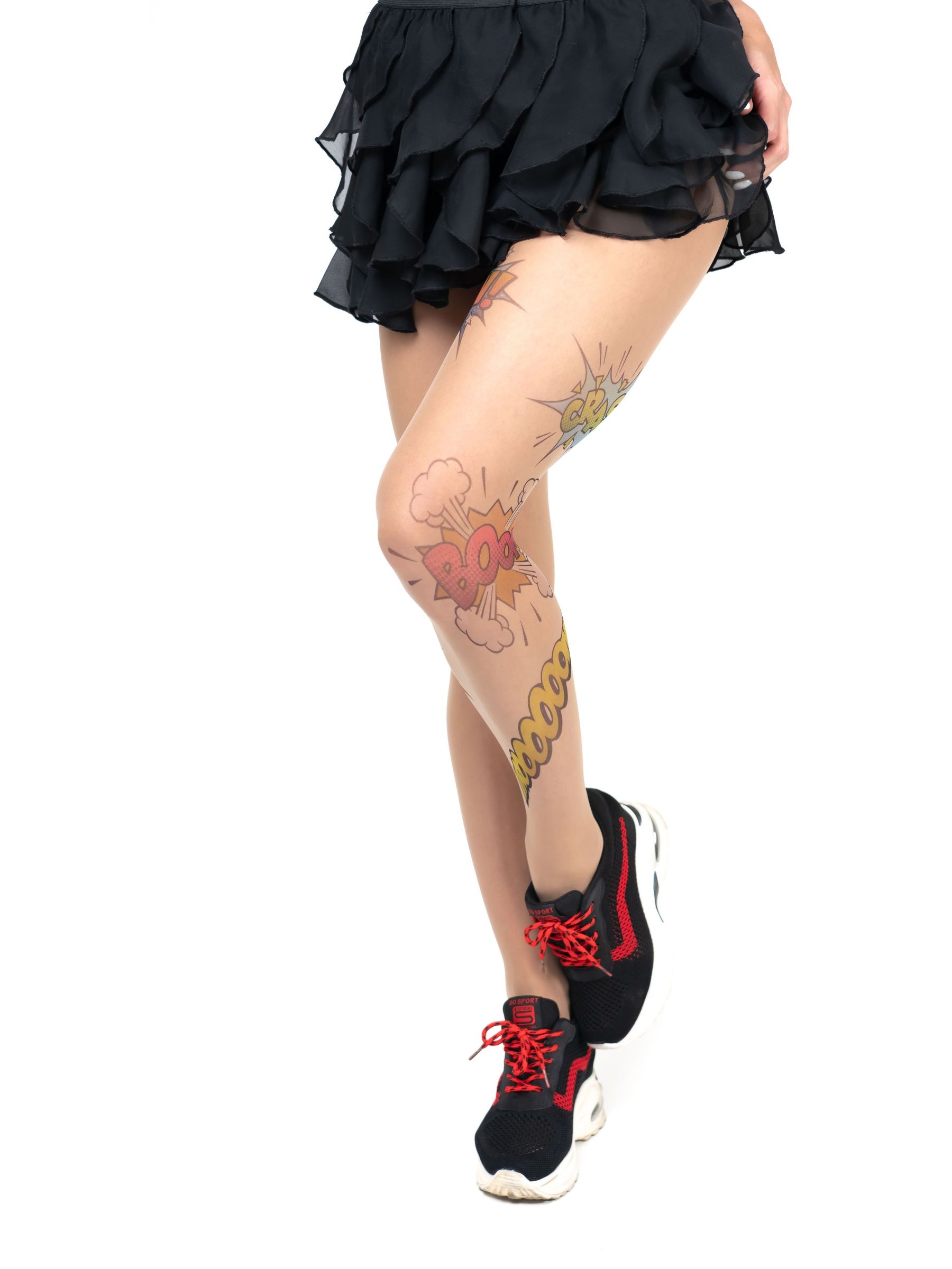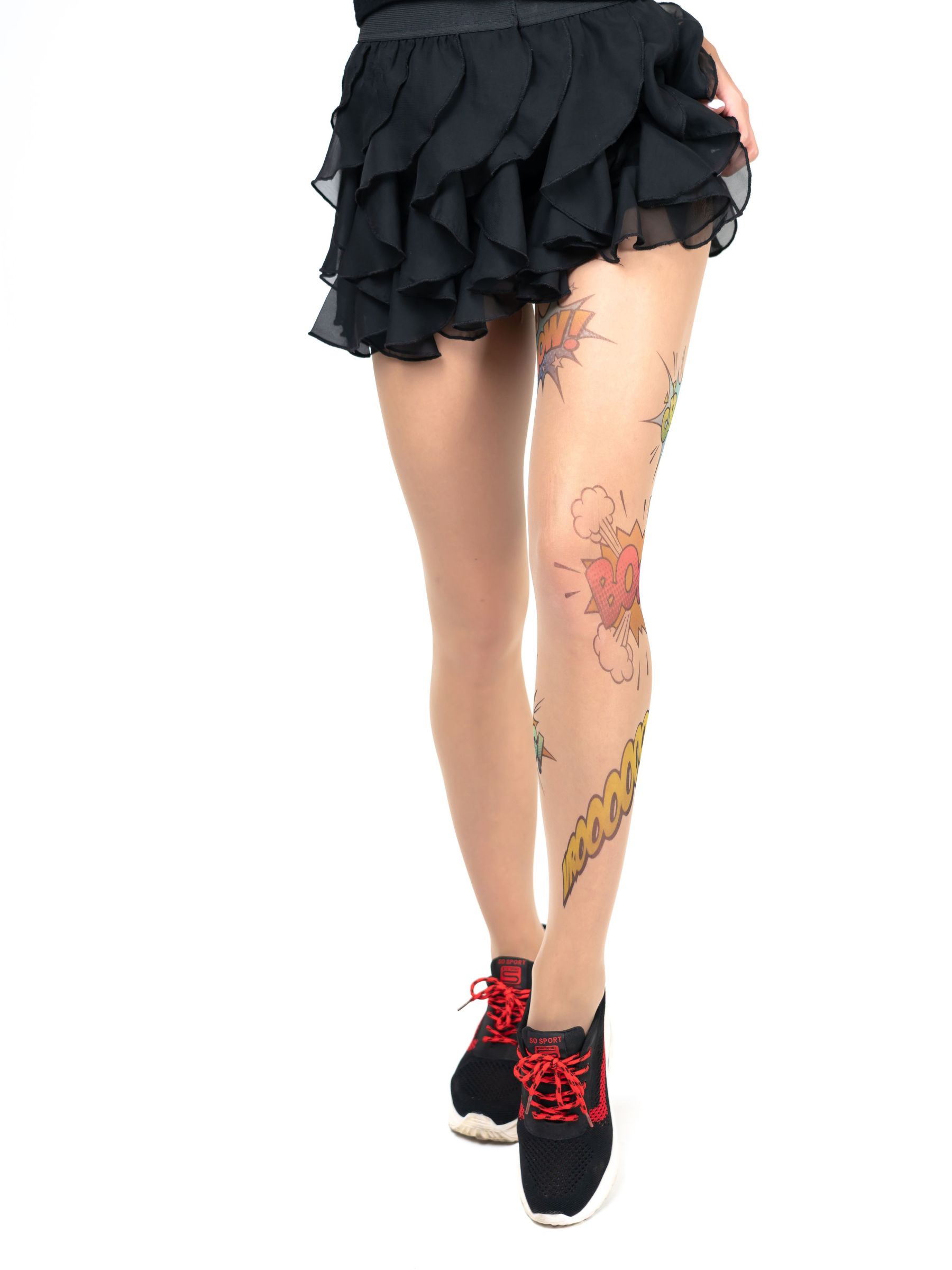 Колготки с принтом в виде цветных спич-баббл на левой ножке. Принт не стирается, не выгорает со временем. Можно стирать в стиральной машине. Крепкие, подойдут на рост от 145 до 180 см. Плотность - 40 ден.