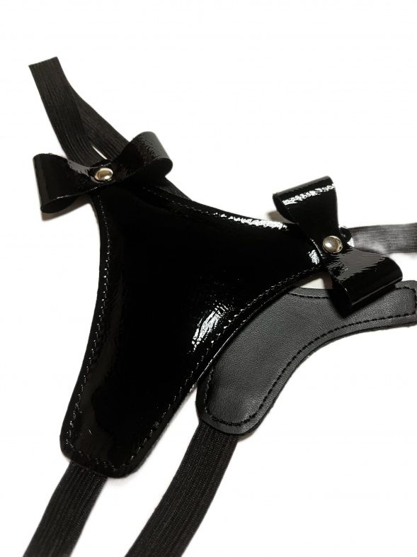 Сексуальные черные стринги, выполненные из эко-кожи. Декорированы спереди двумя бантиками. Лицевая сторона выполнена из лакового материала, а внутренняя из матового. Благодаря эластичной резинке, отлично сядут по фигуре, подойдут на размеры 40-46. Очень красивая и удобная модель, которая поможет создать дерзкий сексуальный образ для вашей любовной игры!