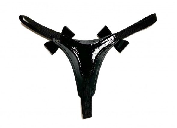 Черные лаковые трусики-стринги с бантиками