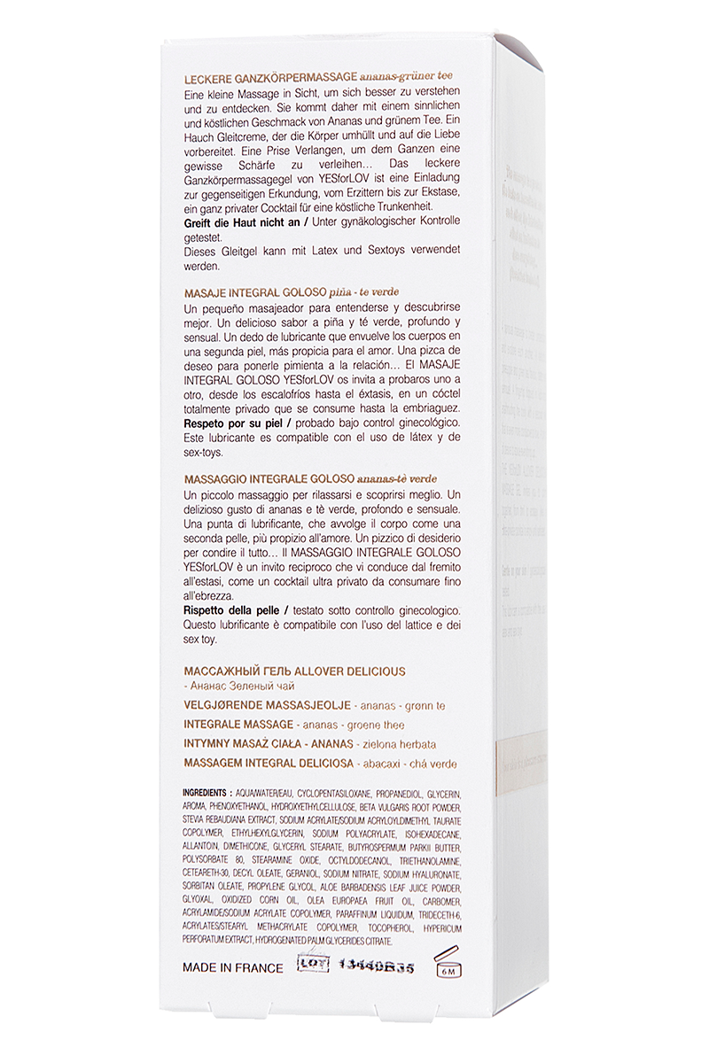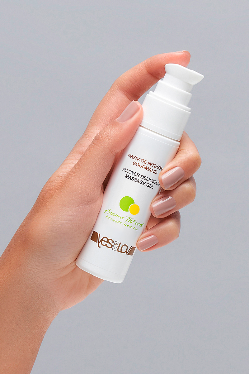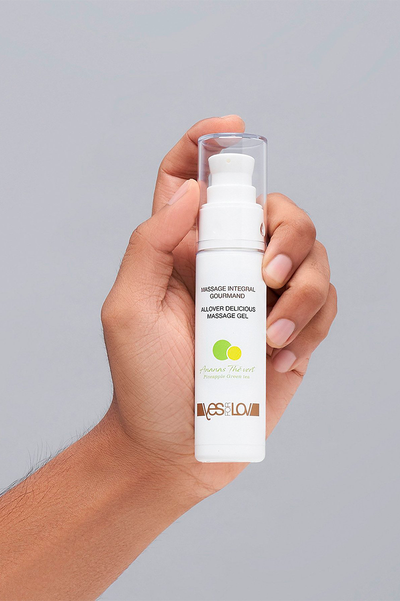 Гель-лубрикант YESforLOV Allover Delicious Massage Gel с ароматом и вкусом ананаса и зелёного чая — универсальный ароматный продукт для классического секса и чувственного массажа. Имеет три варианта использования:
