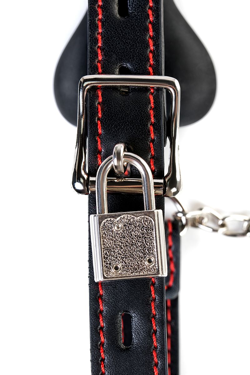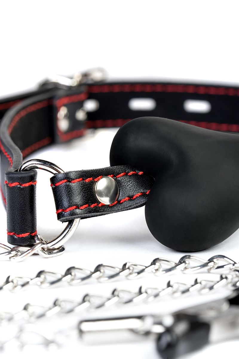 Силиконовый кляп-трензель на ремешке из PU-кожи лишает возможности разговаривать, при этом его комфортно прикусывать. Дополнительно стимулировать нижнего можно изменяя степень давления на соски зажимами-крокодилами.