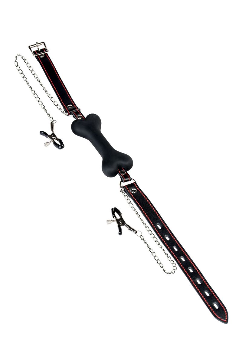 Черный кляп-трензель Theatre в виде косточки с зажимами для сосков