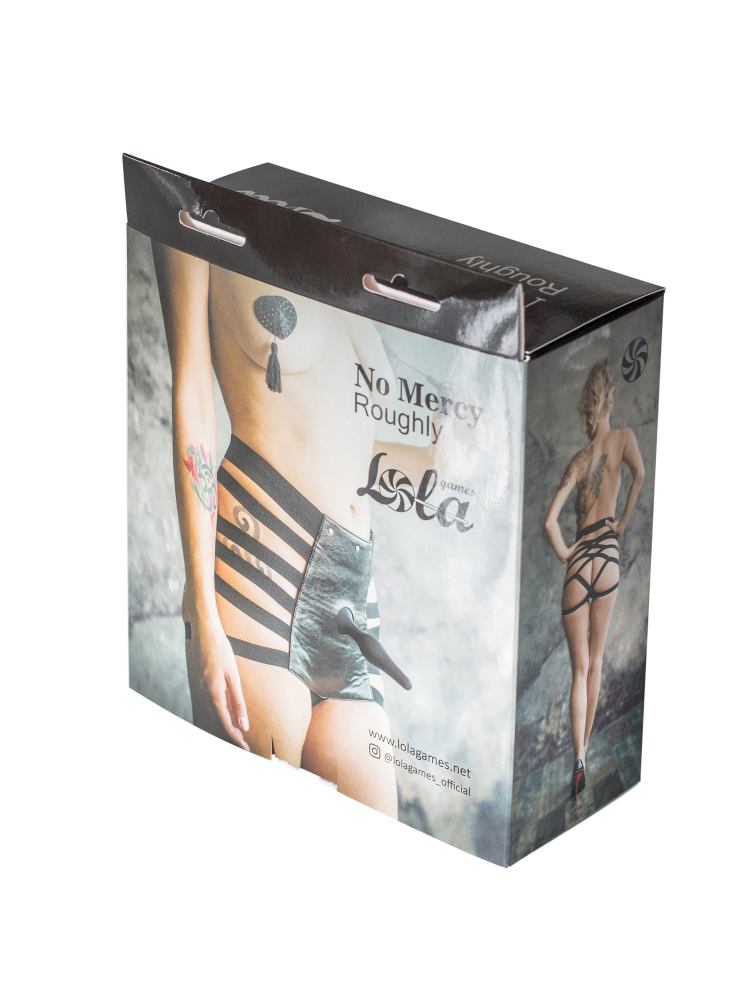 Действительно стильные женские трусики для страпона No Mercy Roughly имеет не только необычный вид, но и довольно удобную конструкцию. Несколько эластичных ремешков поддерживают вставку из искусственной чёрной кожи, к которой через специальное отверстие диаметром 3,5 см крепится любая игрушка с присоской, которая приобретается отдельно и в комплекте не идёт.
