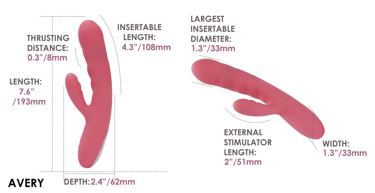 Вибратор-кролик Avery обеспечивает одновременную вагинальную и клиторальную стимуляцию, комбинация которых в считанные минуты доведёт до оргазма. Наслаждение усиливают 5 вибро-режимов в 5 уровнями интенсивности, а также 5 режимов возвратно-поступательных режимов, имитирующих секс. Вибрацию на вагинальном и клиторальном отростках можно включать как одновременно, так и по отдельности.