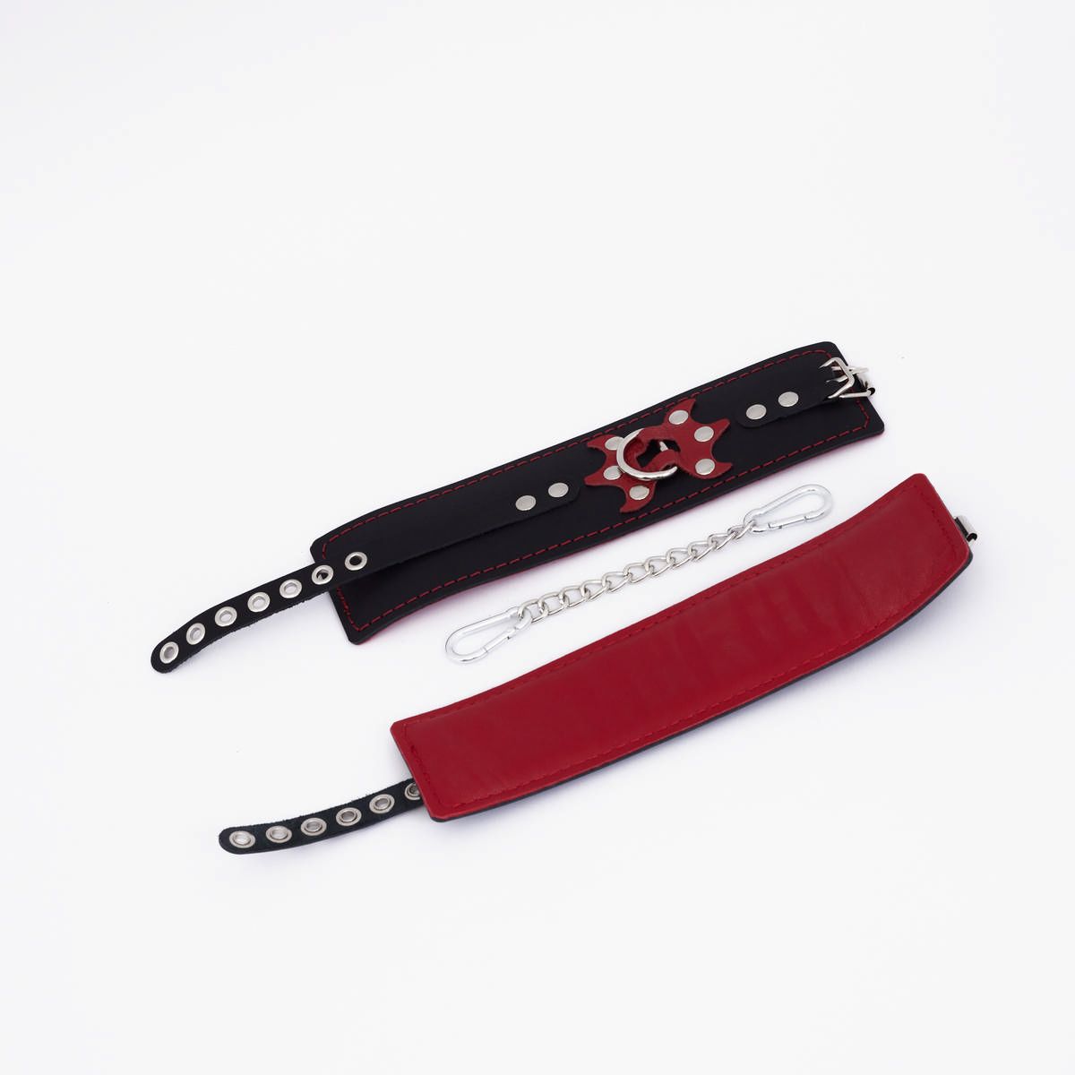 Изделие состоит из двух слоев натуральной кожи : основной слой – лицевая часть, и подкладка красного цвета с мягким наполнителем , которая обеспечивает комфортное и безопасное использование, не натирая кожу. Красная декоративная строчка добавляет изделию стильный акцент, подчеркивая его элегантность. Особый шарм оковам придает элемент в виде трезубца , который вместе с игрой цветов и фактур пробуждает самые смелые эротические фантазии.