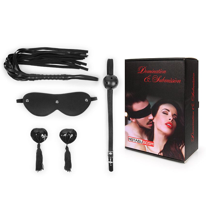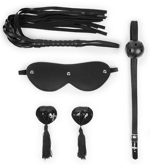 Эротический набор в черном цвете: маска, кляп, пэстисы, плётка - lovestoryshop.ru