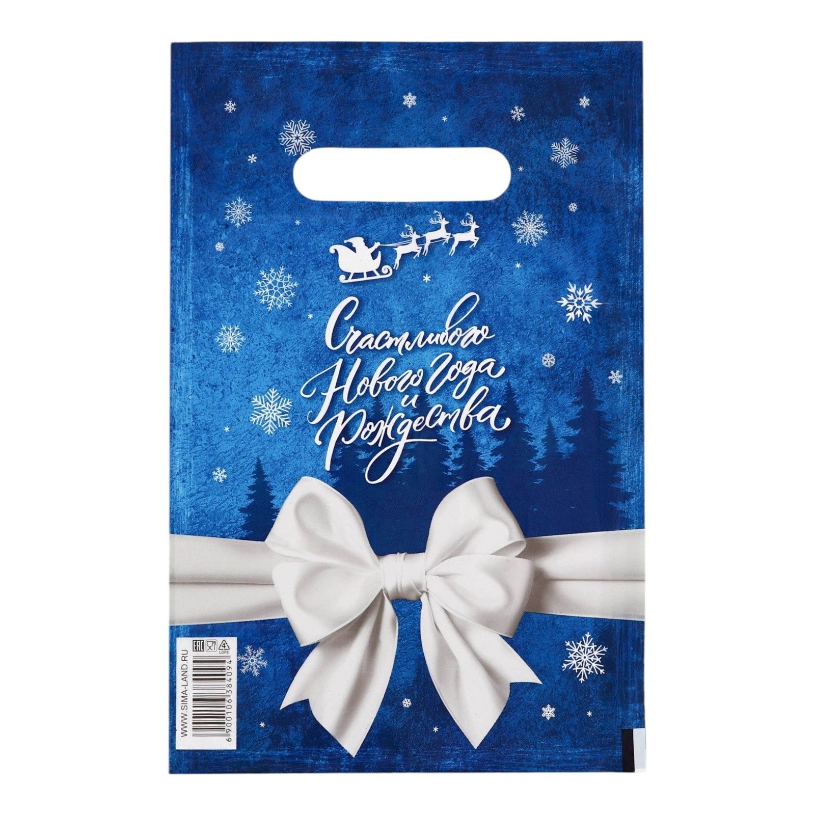 ОписаниеСине-белый подарочный новогодний пакет с вырубной ручкой (20х30 см).