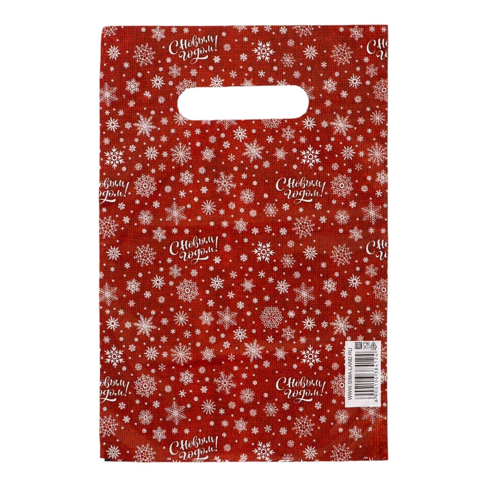 ОписаниеКрасный подарочный новогодний пакет с вырубной ручкой (20х30 см).
