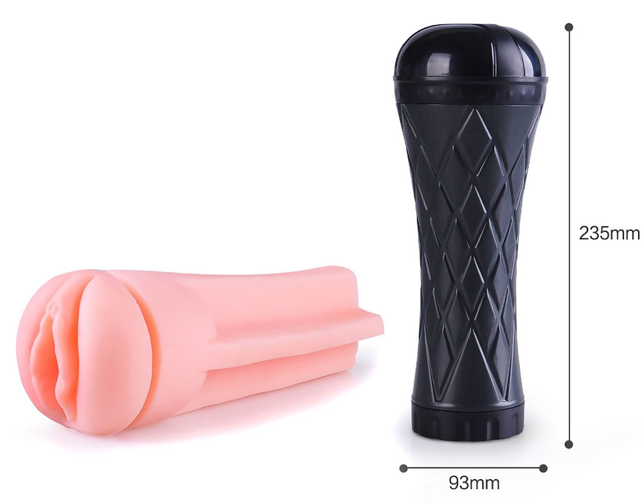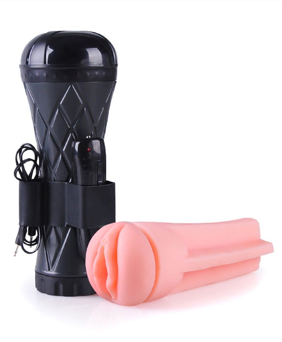Телесный мастурбатор-вагина в черной колбе с вибрацией