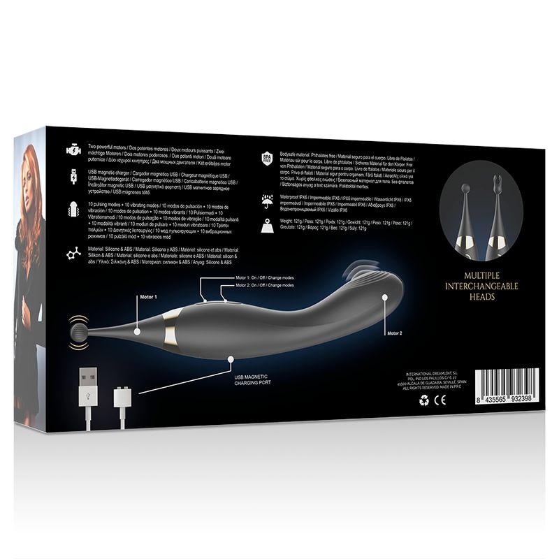 Уникальный вибратор для женщин, созданный для двойной стимуляции и максимального удовольствия. Эргономичная форма идеально направляет игрушку на точку G и клитор, обеспечивая интенсивную и точную стимуляцию благодаря встроенному мини-шарику с волнообразными движениями. Два мощных мотора позволяют работать одновременно или отдельно, предлагая 10 режимов пульсации и 10 режимов вибрации, которые можно комбинировать для создания до 20 вариантов ощущений. Рельефная структура и гладкая поверхность из гипоаллергенного силикона делают введение мягким и комфортным, а округлый наконечник точно воздействует на все эрогенные зоны: клитор, малые половые губы, соски или промежность. Вибратор полностью водостойкий (IPX6), что позволяет использовать его в душе или ванной, и оснащён встроенным аккумулятором с магнитной USB-зарядкой: полный цикл зарядки занимает около 120–130 минут, обеспечивая до 100 минут непрерывного удовольствия. Изготовлен из медицинского силикона. Диаметр вагинальной части - 3,5 см.