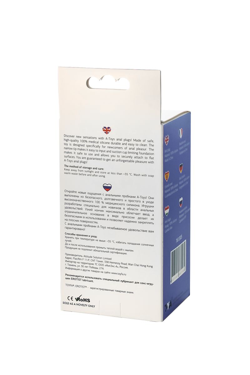 Откройте новые ощущения с анальными пробками A-Toys! Она выполнена из безопасного, долговечного и простого в уходе высококачественного 100 % медицинского силикона. Игрушка разработана специально для новичков в области анальных удовольствий. Узкий кончик максимально облегчает ввод, а ограничительное основание в виде присоски делает ее безопасной в использовании и позволяет надежно закреплять на плоских поверхностях. С анальными пробками A-Toys незабываемое удовольствие вам гарантировано!