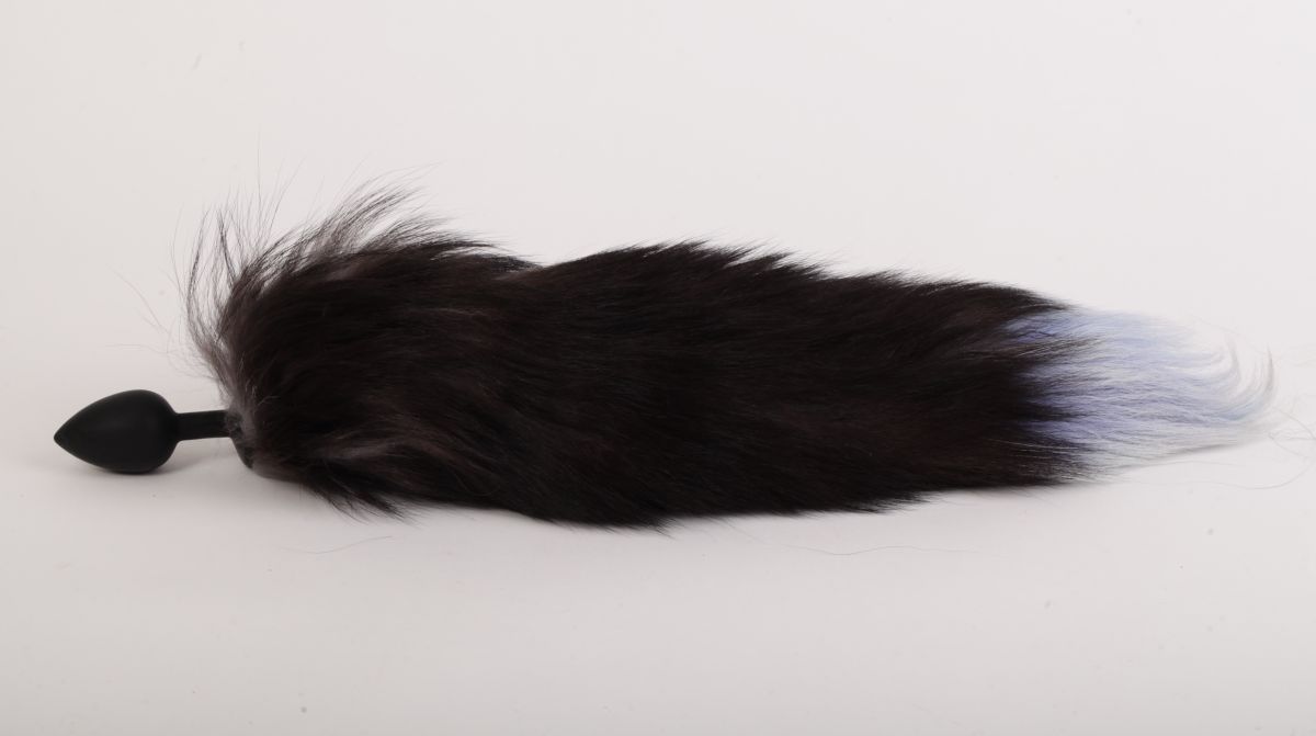 Силиконовая анальная пробка с длинным черным хвостом Серебристая лиса