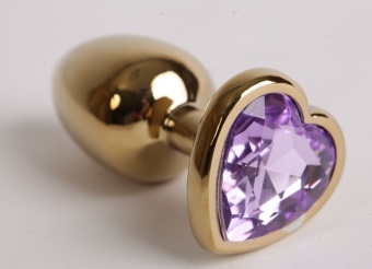 Золотистая анальная пробка с сиреневым стразиком-сердечком - 7,5 см.