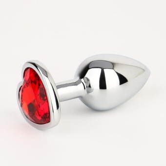 Серебристая анальная пробка с красным кристаллом в форме сердца - 7 см.