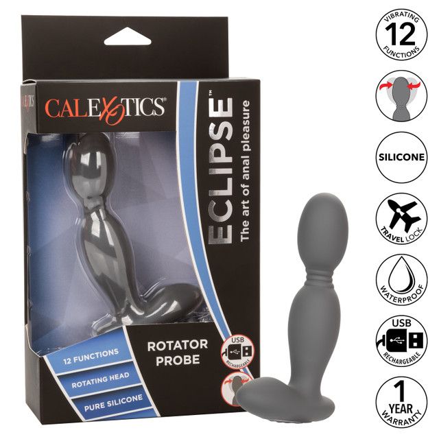 Вибратор Eclipse Rotator Probe обеспечивает эффективную и качественную стимуляцию простаты своей анатомической формой, 12 режимами вибрации и мощной ротацией кончика игрушки. Контурный ограничитель не дает вибратору полностью уйти внутрь анального отверстия, а также дает возможность носить аксессуар внутри тела и использовать во время секса.