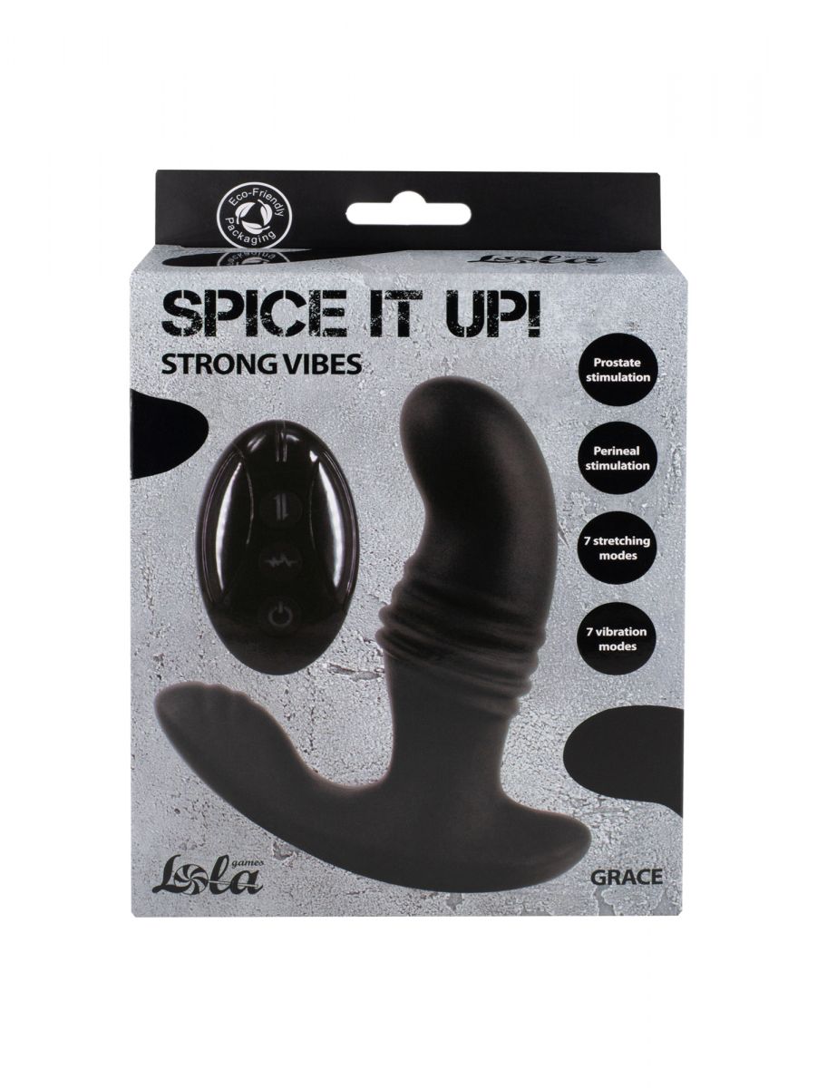 Spice it Up Grace - это водонепроницаемый силиконовый массажер простаты с удобным дистанционным пультом управления. Игрушка имеет два вибромотора - в верхней части и в зоне для стимуляции промежности. Каждый мотор оснащен 7 режимами. Также массажер может пульсировать, растягиваясь и сжимаясь с разной частотой, воплощая 7 различных паттернов. Анатомически выверенная проникающая часть с загнутым кончиком, вкупе с ее размерами, гарантированно достанет до простаты, усиливая потенцию и делая эякуляцию ярче. Массажер заряжается магнитным зарядным устройством, пульт ДУ работает на расстоянии до 15 метров. Рабочая длина - 11 см.