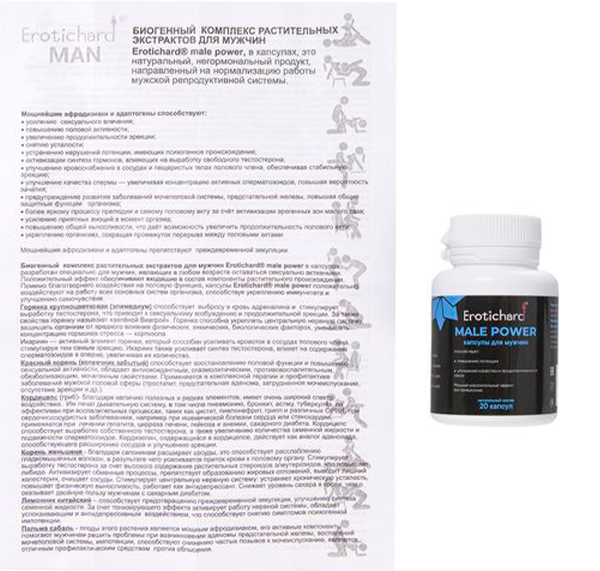 Капсулы возбуждающие для мужчин Erotichard, MALE POWER, 20 капсул