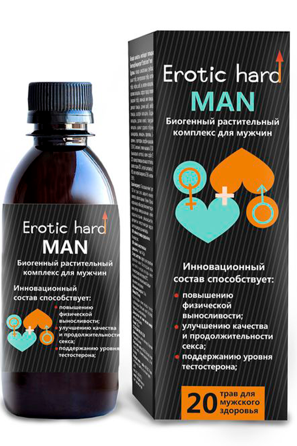 Биогенный концентрат “Erotic hard” MAN — возбуждающее средство растительного происхождения для мужчин. Состав разработан российскими учеными. Это уникальное сочетание современной науки и народных рецептов оздоровления. Богатейший состав экстракта из 20 растений, L-аргинина и L-триптофана благодаря высокому содержанию в них гликозидов, флавоноидов, каротиноидов, витаминов, минералов, особенно важных для мужской силы витамина Е и цинка, дубильных, слизистых и других веществ.
