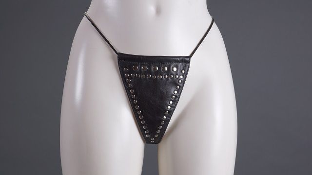 ОписаниеЖенские трусики изготовлены из натуральной кожи и украшены узором из заклепок. При производстве использована никелированная фурнитура. Размер регулируется ремешками.