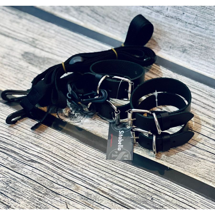 ОписаниеВ комплект входят наручники, оковы и две растяжки на кровать. Наручники и оковы крепятся к ремешкам при помощи прочных пластиковых карабинов. Длина каждого ремешка - 2,7 м.