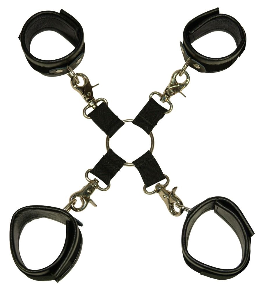 Чёрная бондажная фиксация: крестовина, наручники и оковы