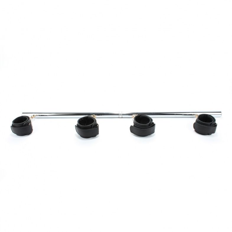 Металлическая штанга серебристго цвета. По всей длине на одинаковом расстоянии друг от друга расположены крепления для рук и ног в виде оков. Оковы изготовлены из кожи, украшены заклепками. Размер регулируется при помощи застежек-липучек. Оковы крепятся к штанге при помощи карабинов. Ширина оков - 5 см.