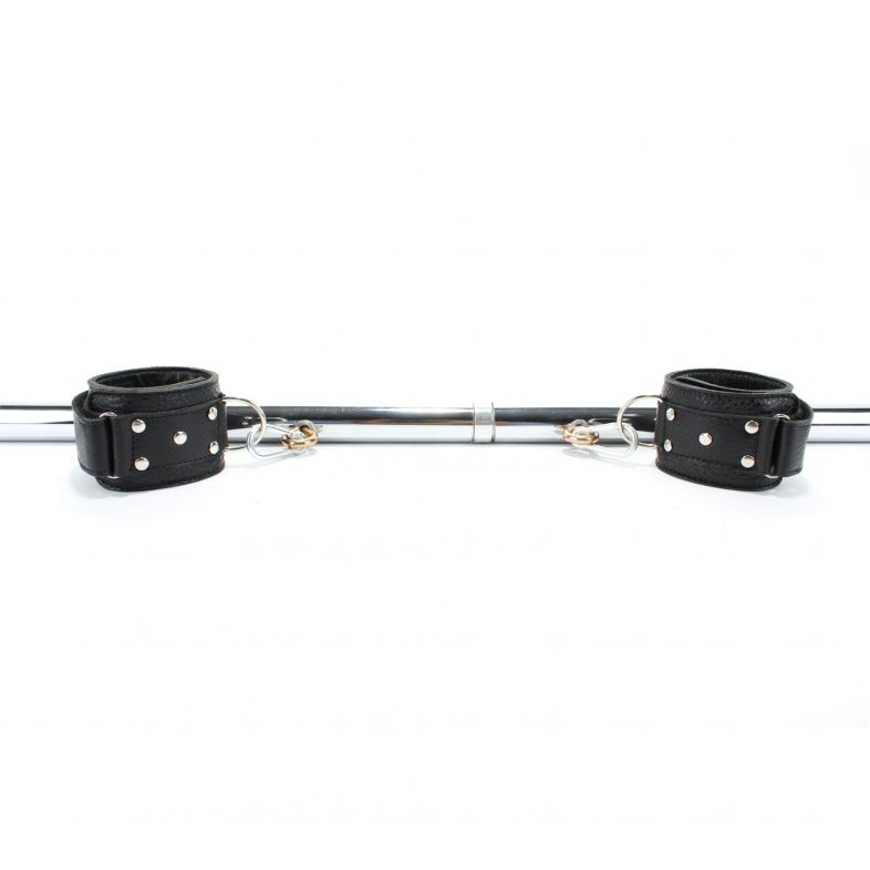 ОписаниеМеталлическая штанга серебристго цвета. По всей длине на одинаковом расстоянии друг от друга расположены крепления для рук и ног в виде оков. Оковы изготовлены из кожи, украшены заклепками. Размер регулируется при помощи застежек-липучек. Оковы крепятся к штанге при помощи карабинов. Ширина оков - 5 см.