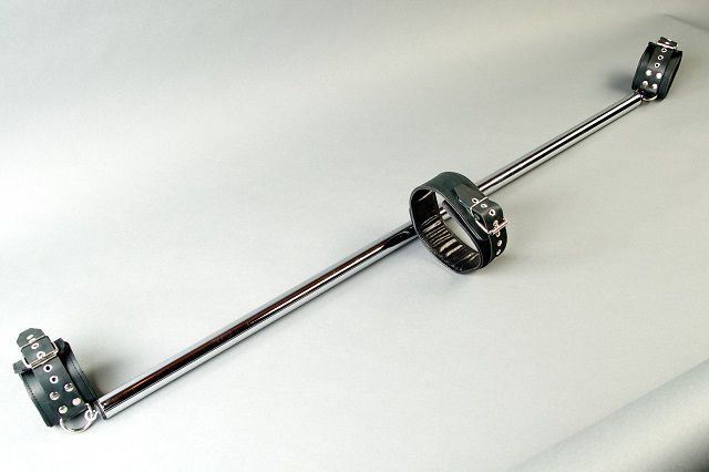Данный БДСМ комплект- коромысло изготовлен из натуральной кожи черного цвета и металлической штанги.С помощью данного бондажа вы можете надежно зафиксировать руки и шею.Размер наручей и ошейника регулируется при помощи ремешков. Максимальный обхват ошейника - 44 см.,минимальный - 33 см.