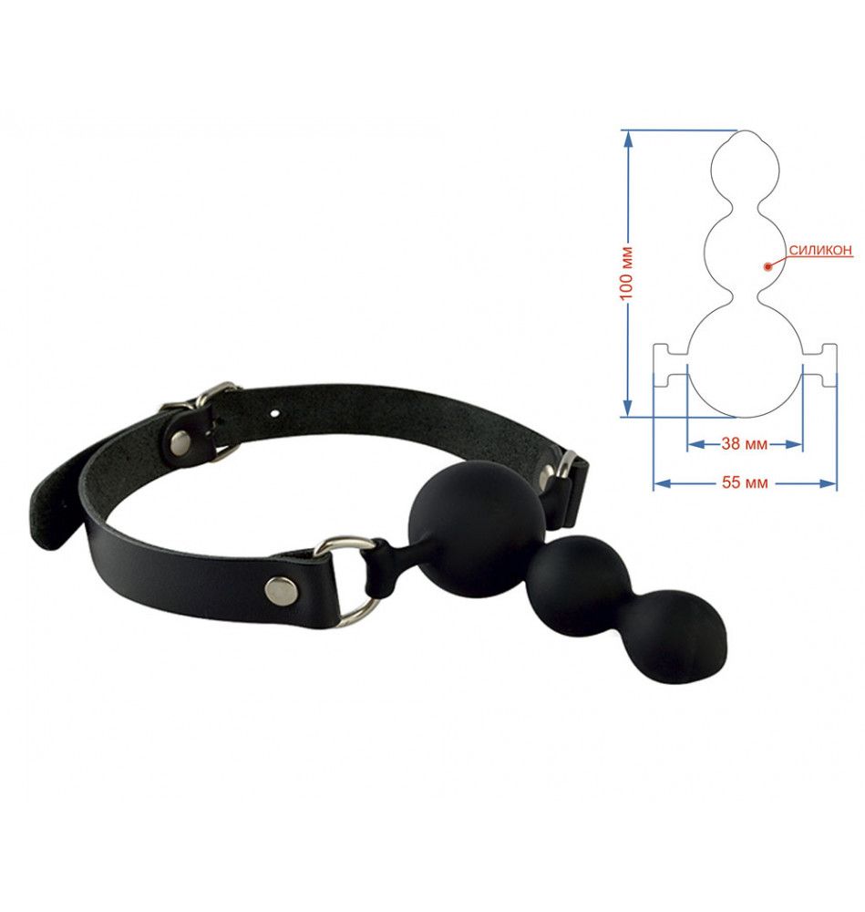 Силиконовый кляп в виде последовательно расположенных сфер, прикреплен к ремешкам из натуральной кожи. Регулируется кляп при помощи металлической пряжки. Металлическая фурнитура имеет никелевое покрытие. Общая длина 59 см. Max диаметр шара 38 мм, длина кляпа 10 см. Ширина ремешков 20 мм. Длина кляпа - 10 см.