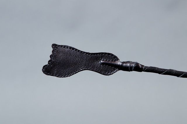 Стек состоит из гибкой основы,овитой натуральной кожей черного цвета,наконечника-ступни и удобной рукояти с петлей для надевания на руку (темляк).