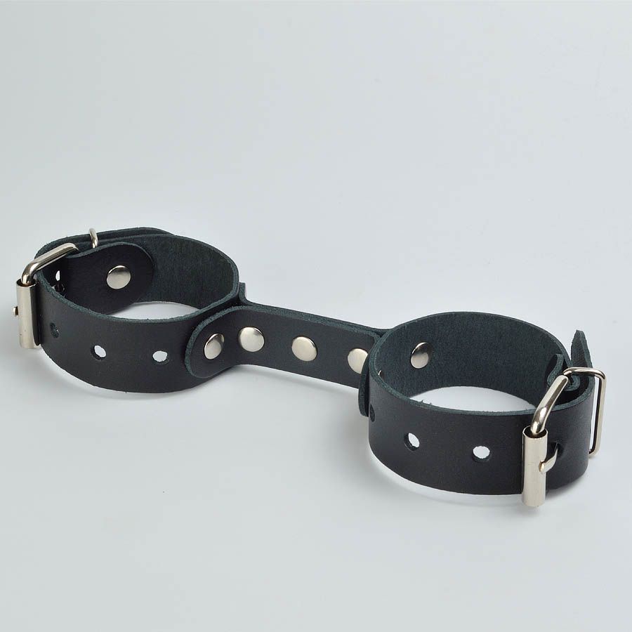 Наручники изготовлены из ременной кожи. Фурнитура никелированная. Наручники имеют кожаную перемычку, на которой зафиксированы наручники. Максимальный охват - 24 см.
