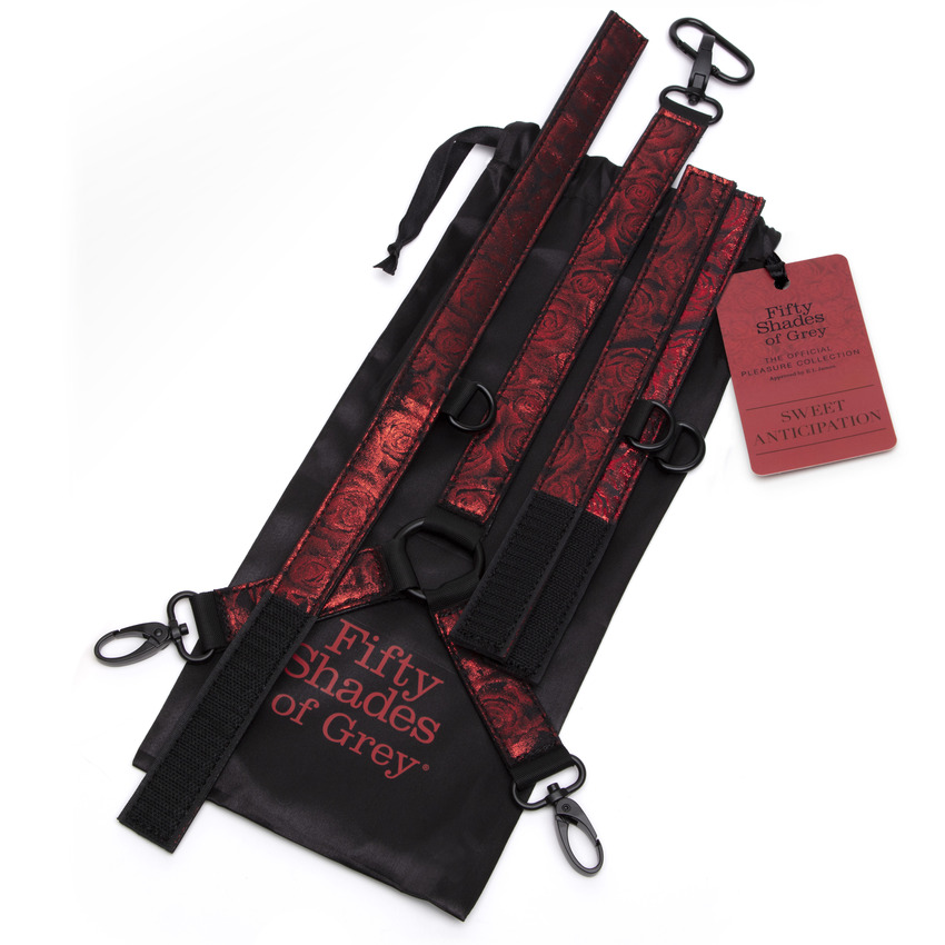 Ошейник с наручниками Fifty Shades of Grey Sweet Anticipation — БДСМ-атрибут для ролевой игры и фиксации. Двухсторонний дизайн позволяет использовать разные версии лицевой стороны материала — классическую черную кожу или принт с красными розами. В комплект входит тонкий ошейник с колечком, соединительная часть и изящные наручники — между собой все элементы закрепляются при помощи металлических карабинов.