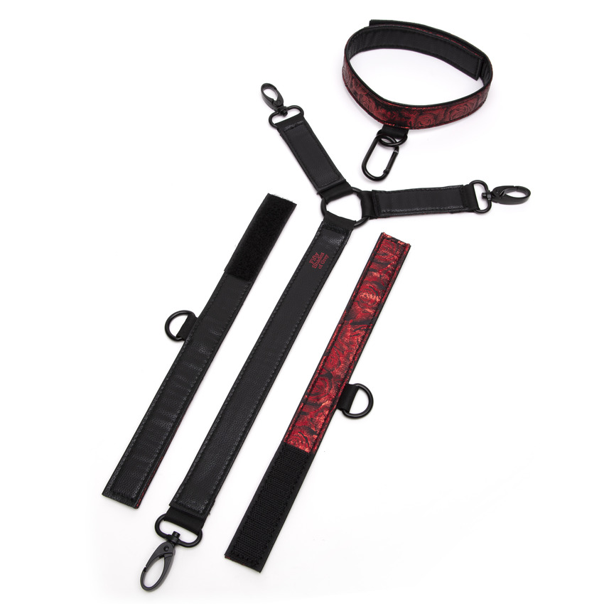 Ошейник и наручники регулируются по обхвату при помощи липучек. Ошейник — 45 см в длину, 2,5 см в ширину. Наручники — 26,5 см в длину, 2,5 см в ширину. Соединяющие ремешки: средний — 24,5 см в длину, ремешки к наручникам по 7,5 см каждый.