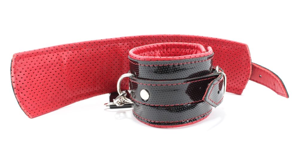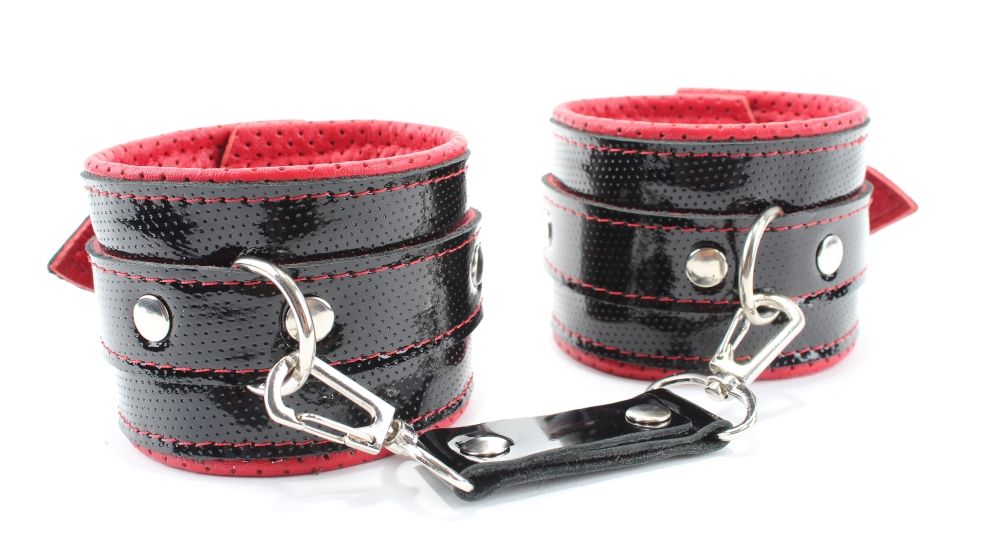 Лаковые чёрно-красные перфорированные наручники