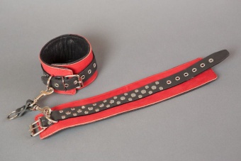 Наручники ручной работы — это ваш помощник в реализации самых необузданных фантазий в БДСМ-играх. Они не нарушают кровообращение, просты в применении и обеспечивают надежную фиксацию. Данная модель изготовлена из натуральной кожи черного и красного цветов с геометрическим рисунком из двух видов заклепок. Наручники оснащены удобным фиксирующим ремешком,позволяющим регулировать размер наручника. Мягкая подкладка (пена) обеспечит комфорт и безопасность. Ширина - 6 см.