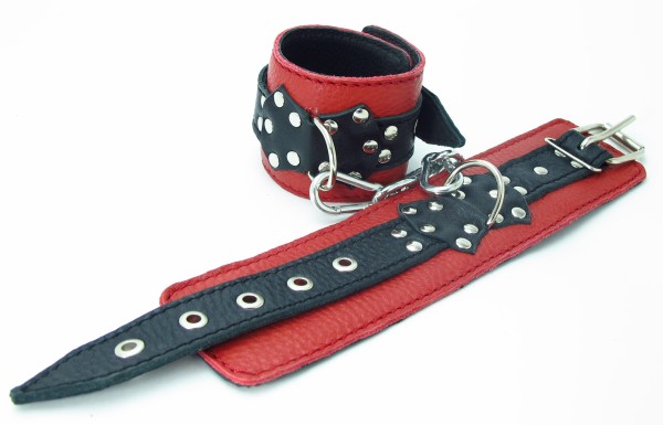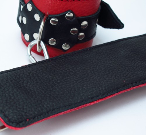 Красные наручники с чёрными проклёпанными ремешками с пряжкой. Ширина - 5 см.