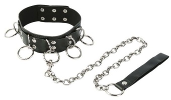 Атрибут украшен 6-ю парами колец и хромированными заклёпками. К ошейнику также прикреплён поводок в виде длинной цепочки. Размер ошейника регулируется. Ширина - 4 см.